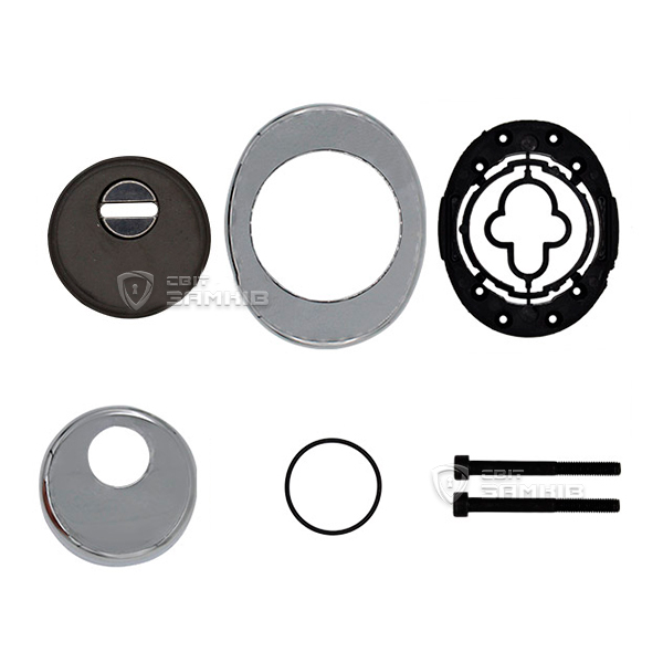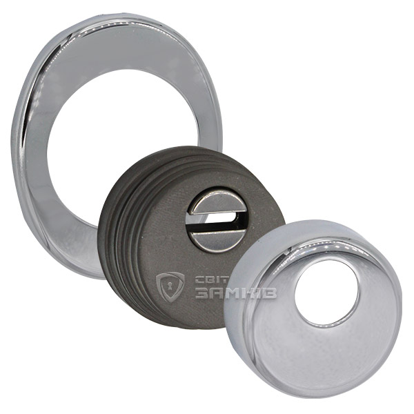 Для монтажу по діаметру протектора робиться отвір в дверному полотні. Кріпиться довкола серцевини стяжними гвинтами, створюючи монолітну конструкцію з нею. Таким чином, протектор захищає її разом із точкою кріплення в дверях від фізичних та силових методів злому — свердління, виламування та вибивання. Доступу до гвинтів кріплення немає і зірвати саму броненакладку надзвичайно складно. Висота (або товщина) її складає 25/33 мм, діаметр - 50 мм. Комплектується декоративною накладкою розміром 85х70 мм для надання дверному полотну більш охайного вигляду. В кольорі “хром” найкраще буде доповнювати двері світлих відтінків - від тепло-сірих до бежевих.
