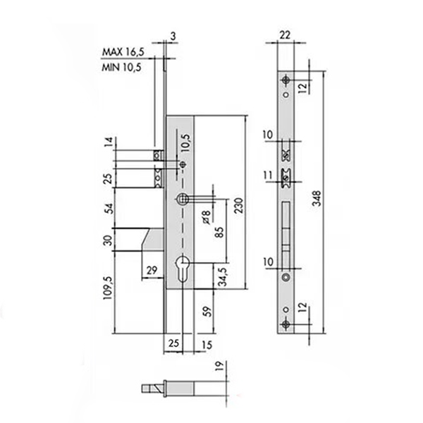 CISA 16215.25 – це електромеханічний замок. Призначений для використання в профільних алюмінієвих дверях та хвіртках, де обмежена глибина установки. Підходить для правих та лівих дверних полотен. Корпус замка виготовлений із оцинкованої сталі, торцева планка з нержавіючої сталі, язичок та ригель нікельовані. Тому замок можна використовувати при вуличних умовах. Керування замком здійснюється електричним імпульсом, який дає пристрій керування, або серцевиною. Це означає, що відчинити двері ручками з обох сторін (розблокувати язичок) можливо тільки після подачі електричного імпульсу. До прикладу, це можуть бути системи контролю доступу або віддалений пристрій (реле часу, кодонабірна панель чи кнопки).