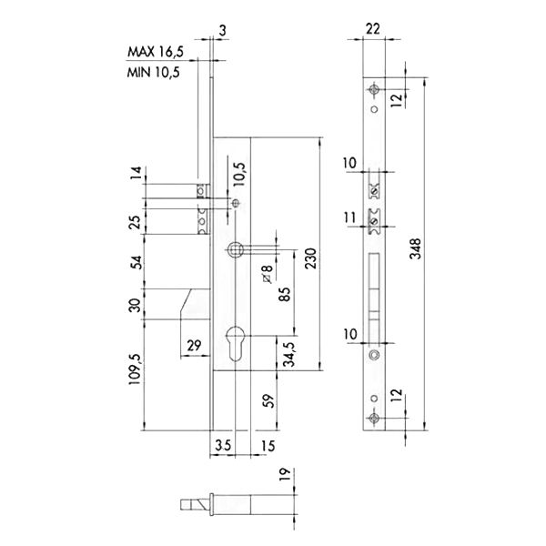 CISA 16215.35 – це електромеханічний замок. Призначений для використання в профільних алюмінієвих дверях та хвіртках, де обмежена глибина установки. Підходить для правих та лівих дверних полотен. Корпус замка виготовлений із оцинкованої сталі, торцева планка з нержавіючої сталі, язичок та ригель нікельовані. Тому замок можна використовувати при вуличних умовах. Керування замком здійснюється електричним імпульсом, який дає пристрій керування, або серцевиною. Це означає, що відчинити двері ручками з обох сторін (розблокувати язичок) можливо тільки після подачі електричного імпульсу. До прикладу, це можуть бути системи контролю доступу або віддалений пристрій (реле часу, кодонабірна панель чи кнопки). Блокування ригелем та язичком здійснюється автоматично простим зачиненням дверей. Ригель можна відкрити тільки механічним способом за допомогою циліндра стандарту EURO DIN.