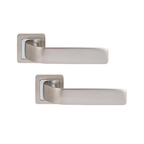 Ручки на розеті торгової марки RDA. Матеріал виготовлення – цинковий сплав, що дозволяє обирати їх як для міжкімнатних так і для вхідних дверей. Багатошарове гальванічне покриття гарантує збереження зовнішнього вигляду ручки до 60 місяців. Додатково металевий пружинний механізм забезпечує легкість натискання ручки та відсутність проблем з її провисанням. Незвичайне поєднання кольорів - хром / матовий сатин нікель – доречно підкреслить інтер'єр в ніжних світлих відтінках. Монтаж ручки простий і не потребує додаткових зусиль. На дверному полотні мають охайний та естетично привабливий вигляд. Сучасний дизайн в стилі хай-тек чудово доповнить дверне полотно з прямими лініями чи вставками з прямокутного скла.