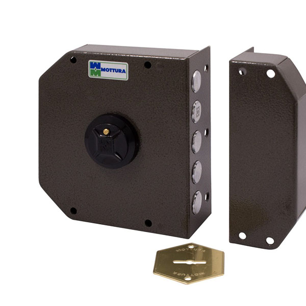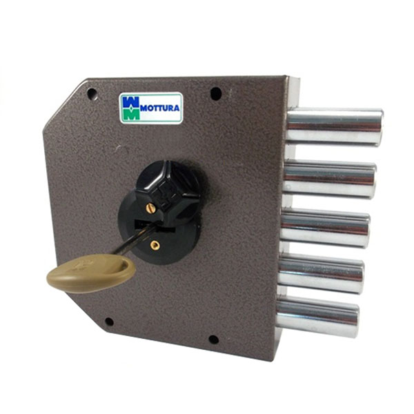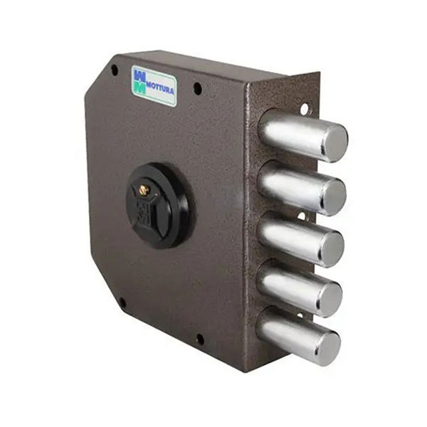 MOTTURA 20500VD – це 5-ригельний італійський замок. Встановлюється НАКЛАДНИМ способом на дверне полотно. Використовується на вхідних дерев’яних та металевих дверях квартири чи будинку. Також його часто обирають для монтажу в гаражах чи складських приміщеннях, де встановити врізний замок немає можливості або це не доцільно.