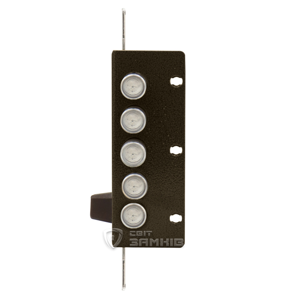 Дана модель призначена для дверей ЛІВОГО відкривання. Замок керується серцевиною стандарту EURO DIN. Вона приводить в дію 5 круглих стальних ригелів діаметром 18 мм та додаткові провушини, до яких можна під’єднати тяги і девіатори. Завдяки цьому закривання відбувається в 3 сторони. Повний вихід ригелів на 30 мм відбувається за 2 оборота ключа. Головною захисною фішкою стало блокування при спробах вибивання чи перелому серцевини. Зворотня планка входить в комплект.