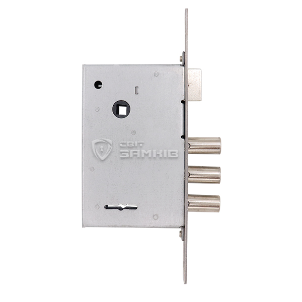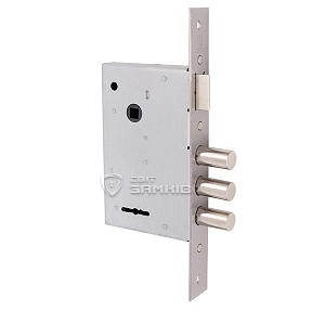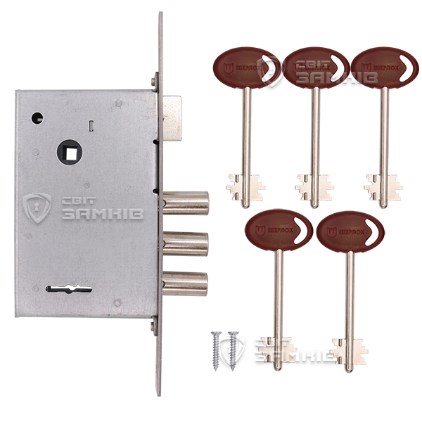 Закривання здійснюється 3-ма ригелями зі сталі діаметром 13,8 мм. Вони надійно фіксують двері, забезпечуючи достатній рівень безпеки. Язичок реверсивний, тому замок можна встановити як і на ліві, так і на праві двері. В даній версії в комплектації 5 ключів.