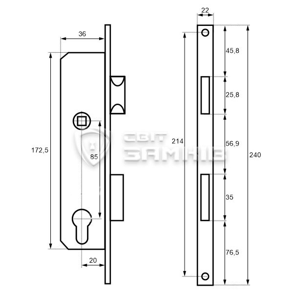 • Корпус замка взаємозамінний із іншими замками серії: KALE 153 U-20, SANTOS 726 (BS20*85мм, 22мм).