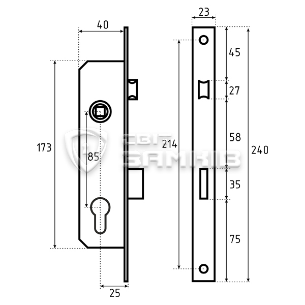 • Корпус замка взаємозамінний із іншими замками серії: KALE 153 U-25, SANTOS 726 (BS25*85мм, 22мм).