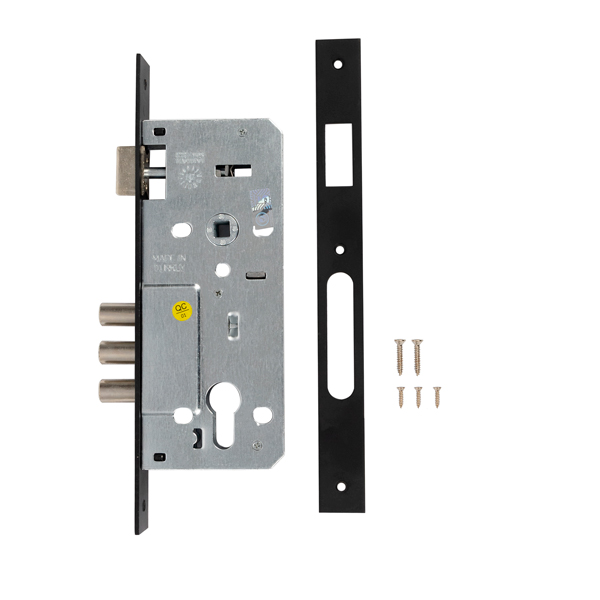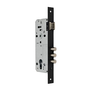 В конструкції наявні сталеві ригелі діаметром 12 мм. Їх повний вихід складає 20 мм. Механізм керується ручками та серцевиною стандарту EURO DIN. Вона в комплект не входить та докуповується окремо залежно від Ваших потреб. Завдяки реверсивному цинковому язичку механізм підходить як для ліво-, так і правосторонніх дверей. Замок має отвори для кріплення протектора на серцевину та стяжних гвинтів ручок на розеті.