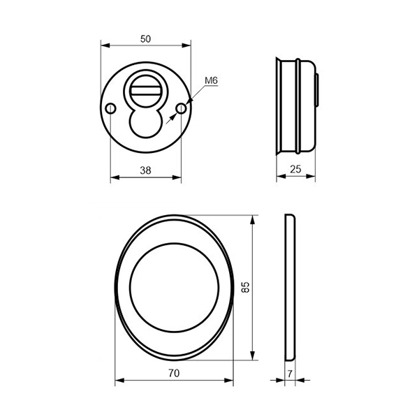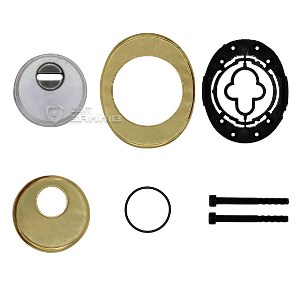 Для монтажа по его диаметру делается отверстие в дверном полотне. Крепится вокруг сердцевины стяжными винтами, создавая монолитную конструкцию с ней. Таким образом, протектор защищает ее вместе с точкой крепления в дверях от физических и силовых методов взлома - сверления, взлома и выбивания. Доступа к винтам крепления нет и сорвать саму броненакладку чрезвычайно сложно. Высота (или толщина) ее составляет 25/33/42 мм, диаметр - 50 мм. Комплектуется декоративной накладкой размером 85х70 мм для предоставления дверному полотну более опрятного вида. В цвете "полированная латунь" лучше будет дополнять двери светлых оттенков.