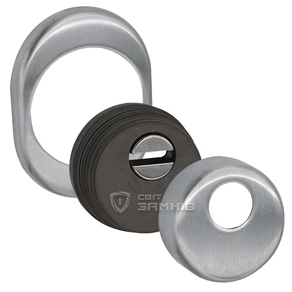 Для монтажа по диаметру протектора делается отверстие в дверном полотне. Крепится вокруг сердцевины стяжными винтами, создавая монолитную конструкцию с ней. Таким образом, протектор защищает ее вместе с точкой крепления в дверях от физических и силовых методов взлома - сверления, взлома и выбивания. Доступа к винтам крепления нет и сорвать саму броненакладку чрезвычайно сложно. Высота (или толщина) ее составляет 25 мм, диаметр - 50 мм. В цвете "матовый хром" лучше будет дополнять двери светлых оттенков - от тепло-серых до бежевых.