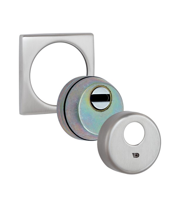 Монтируется врезным методом: по её диаметру делается отверстие в дверном полотне. Крепится вокруг сердцевины стяжными винтами М6 (выдерживают до 4200 кг), создавая монолитную конструкцию с ней. Таким образом, протектор защищает ее вместе с точкой крепления в дверях от физических и силовых методов взлома - сверления, взлома и выбивания. Доступа к винтам крепления нет и сорвать саму броненакладку чрезвычайно сложно. Высота (или толщина) протектора составляет 25 мм, диаметр - 50 мм, внешняя декоративная накладка - 65х65 мм. В квадратном исполнении в цвете матовой нержавеющей стали лучше будет дополнять двери светлых оттенков - от тепло-серых до бежевых.