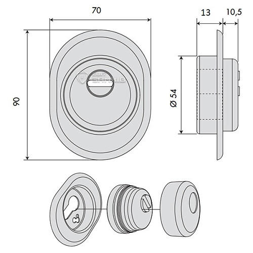 Для монтажа по диаметру протектора производится отверстие в дверном полотне. Крепится вокруг сердцевины стяжными винтами, создавая монолитную конструкцию с ней. Таким образом, протектор защищает ее вместе с точкой крепления в дверях от физических и силовых методов взлома – сверление, выламывание и выбивание. Доступа к винтам крепления нет и сорвать саму броненакладку очень сложно. Высота (или толщина)врезной части составляет 13 мм (+10,5 мм наружной), диаметр – 54 мм. Комплектуется овальным кожухом из стали с наружным размером 70х90 мм.