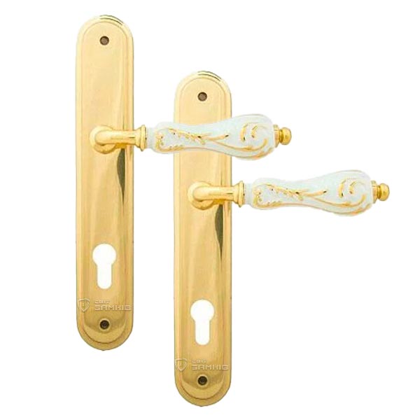 Изысканные ручки на планке итальянской торговой марки FIMET. Представляют собой элегантную дверную фурнитуру, разработанную по современным европейским стандартам качества. Среди других моделей на рынке их отличает длительный срок эксплуатации и высокий уровень надежности. Материал изготовления - латунь. Ручки из такого материала прочные, приятные на ощупь и устойчивые к коррозии. Изысканный классический дизайн идеальный выбор для дверного полотна, которое украшено различными орнаментами или узорами. Удачное сочетание цветов - полированная латунь / белый фарфор с золотом - прекрасно дополнит интерьер в классическом стиле. Гальваническое покрытие способно обеспечить защиту цветового оттенка от повреждений в течение 120 месяцев. Еще одной особенностью этой модели является глухая планка, то есть такие ручки предназначены для использования на межкомнатных деревянных дверях, которые не нужно запирать на ключ или вороток. Пользование такими ручками принесет Вам только удовольствие. Ведь они имеют эргономичную форму и оснащены металлическим пружинным механизмом, что позволит избежать проблем с провисанием и расшатыванием.