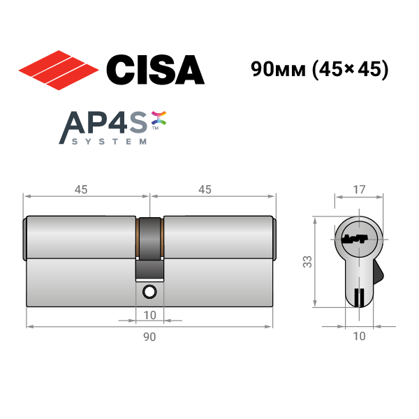 - Цилиндр CISA AP4 S 90 (45*45) никель матовый ⭐