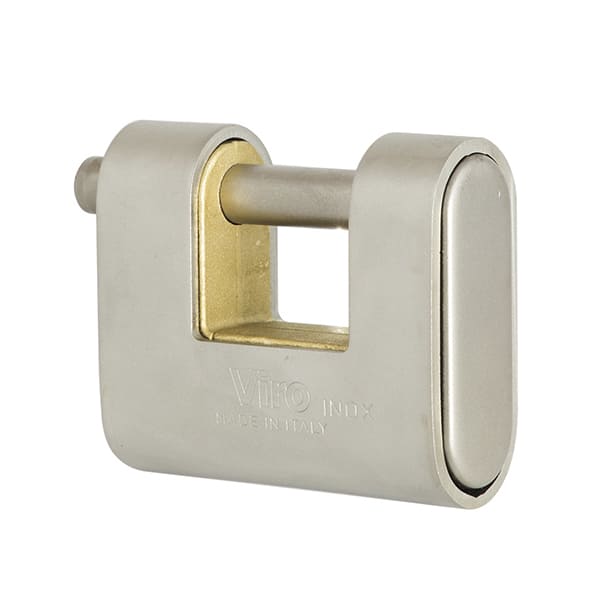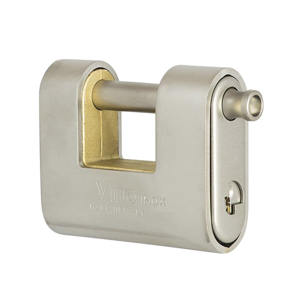 Навесной замок итальянского производства VIRO PANZER ST.STEEL 4117.Х благодаря верхней брони с сатинированной нержавеющей стали AISI 304 максимально устойчив к коррозии. Именно поэтому его без проблем можно использовать для закрывания приморских складов, транспортных контейнеров и других помещений, двери которых выходят на улицу. Сам же корпус выполнен из кованой твердой латуни. Замок имеет дужку из нержавеющей стали AISI 316. Она вращается и имеет защиту от перепиливания. Эта модель замка имеет усиленную защиту от взлома также за счет стального механизма закрывания с 7 штифтами и защищена от высверливания. Управление осуществляется английским ключом.