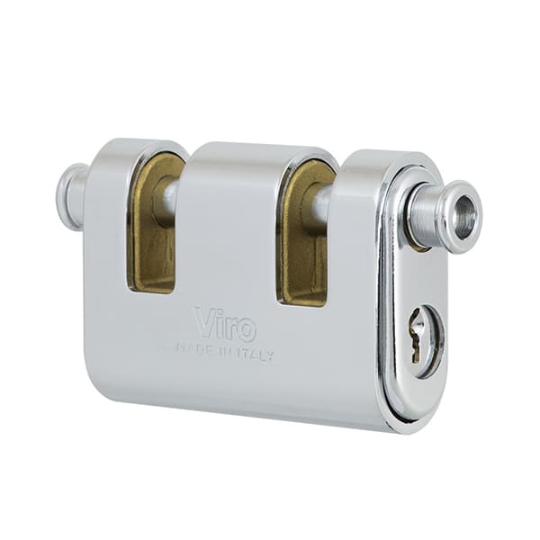 Итальянский навесной замок VIRO PANZER VR.2AS 4126 является уникальным замком благодаря двум независимым дужкам. Это дает возможность использовать его не только для закрывания ворот и дверей различного рода хозяйственных помещений, но и контейнеров грузовиков и тому подобное. Корпус этого замка изготовлен из латуни. Две дужки из закаленной стали конструктивно вращаются и защищены от распиливания. Эта модель замка имеет усиленную защиту от взлома также за счет стального механизма закрывания с 7 штифтами и защищена от высверливания. Управление осуществляется английским ключом.
