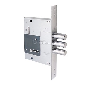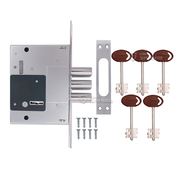 Управление происходит сувальдным ключом. Такой тип секрета позволяет использовать его в помещениях с высокой запыленностью. Например, двери в складе, производственных цехах и тому подобное. Особенностью этой модели является защита от высверливания в виде стальной бронепластины.