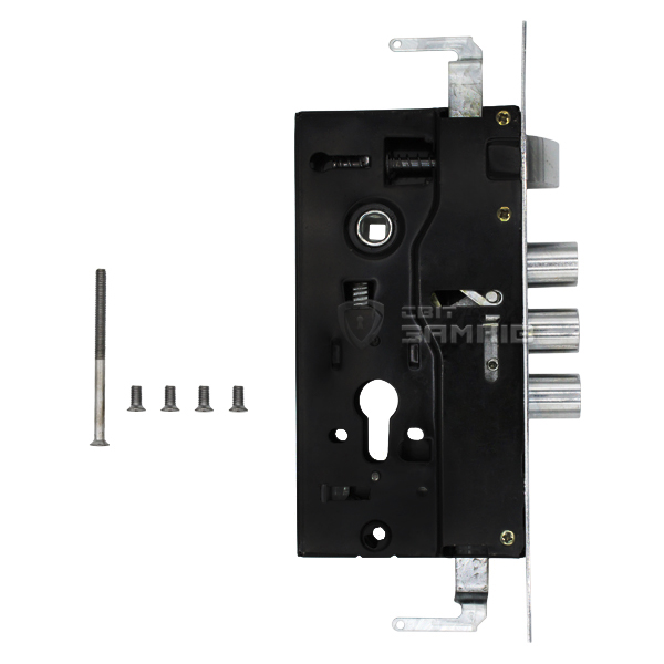 BRUNO BR-62 - врезной цилиндровый замок, который выбирают для замены в «китайских дверях». Дополнительно имеет крепления для тяг, которое при необходимости можно снять. выбирают для металлических дверей в качестве основного замка. Три основные ригели управляются сердцевиной. Дополнительный - воротком. Специально к данному замка существуют несколько вариантов ручек на планке.