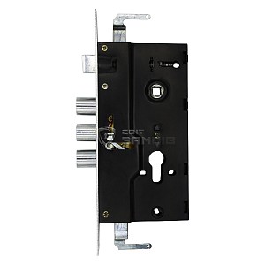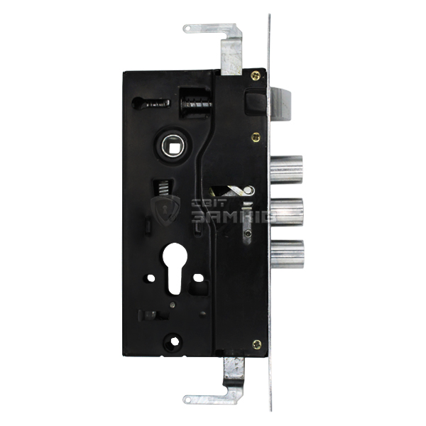 BRUNO BR-62 - врезной цилиндровый замок, который выбирают для замены в «китайских дверях». Дополнительно имеет крепления для тяг, которое при необходимости можно снять. выбирают для металлических дверей в качестве основного замка. Три основные ригели управляются сердцевиной. Дополнительный - воротком. Специально к данному замка существуют несколько вариантов ручек на планке.