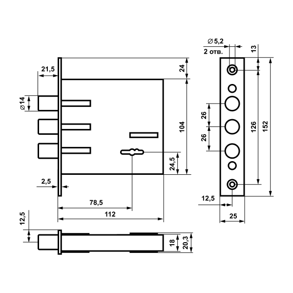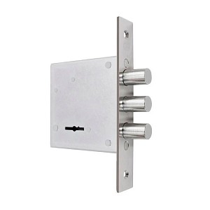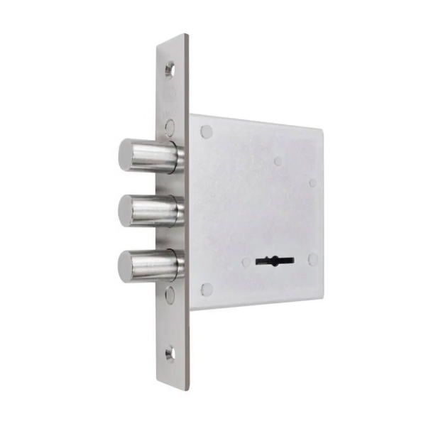 Три стальные ригели диаметром 13,8 мм отвечают за надежное фиксирование двери, гарантируя высокий уровень безопасности. Общая высота выхода составляет 22 мм. Расстояние от центра отверстия запорного элемента до торцевой планки замка (бэксет или дормас) составляет 78,5 мм.