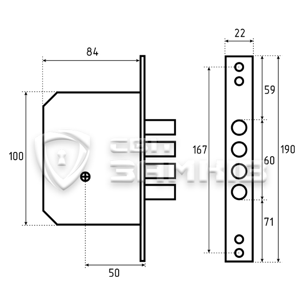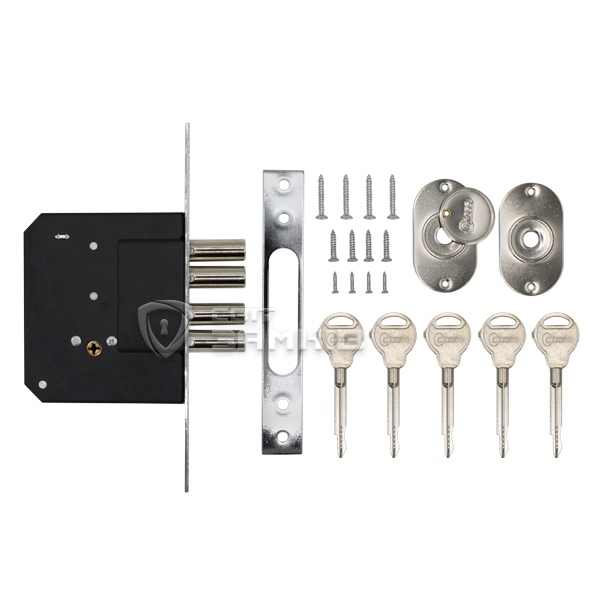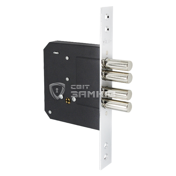 Верхний дополнительный замок, устанавливаемый во входные двери. Из-за простоты механизма замок можно врезать как в левые так и в правые двери. Управление замком осуществляется крестовидным ключом. Полное запирание замка - это три полных оборота ключом, выход запорных ригелей почти на 30 мм.