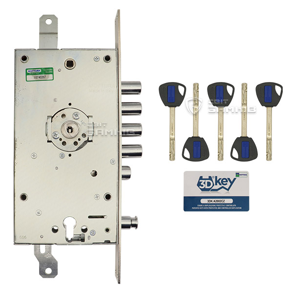 MOTTURA 3DKEY 3D.788 - двухсистемный многофункциональный замок с возможностью установки цилиндрового механизма. 3DKey - замок высокой защищенности для стальных дверей, спроектированный и произведенный исключительно на фабрике MOTTURA. Имеет шестеренчатый привод. Особенностью является наличие уникального элемента - запатентованного нуклео. Оно обеспечивает мягкое бесшумное вращение ключа, в случае потери которого его легко заменить. Сами же ключи имеют шестиугольное сечение с 3-мя кодированными поверхностями и 2-мя дорожками. Дубликаты изготавливаются только на заводе MOTTURA в Италии. Технология 3DKey обеспечивает 10 миллиардов возможных кодовых комбинаций - самая большая секретность всех замков данной ТМ. Превосходит по уровню защищенности как замки с цилиндровым механизмом, так и сувальдные. Замок устанавливается в качестве основного замка на металлические двери. Также особенностью является толщина 25 мм, что дает возможность более широкого использования, а также дополнительного усиления замка с помощью марганцевых пластин.