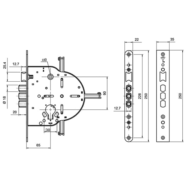 Израильский производитель MUL-T-LOCK известен на рынке качеством своей дверной фурнитуры. Данная модель - это 3-х ригельный врезной замок, который устанавливается на металлические входные двери. Благодаря реверсивному язычку подходит как для лево, так и правосторонних полотен. Управляется ручками и сердцевиной стандарта EURO DIN с шестерней. Она в комплект не входит и докупается отдельно в зависимости от ваших потребностей. Полный выход прямоугольных ригелей размером 18х12 мм составляет 20 мм. Особенностью этого замка является наличие проушин для крепления тяг. Благодаря этому он может закрываться на 4 стороны.