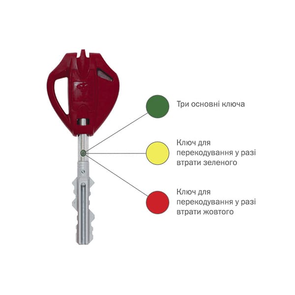 • Механизм использует шесть ключей, 1 + 3 + 1 + 1 (1 монтажный ключ, 3 ключа с зелеными метками для ежедневного использования и кодовая карточка, 4-й ключ с желтой и 5-й ключ с красной метками и кодовая карта для перекодирования (Система «VIP» + «Светофор»).