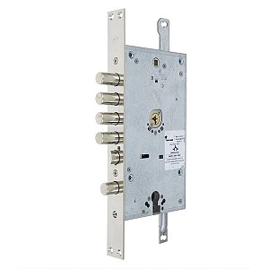 Израильский производитель MUL-T-LOCK известен на рынке качеством своей дверной фурнитуры. Данная модель - это 4-х ригельный замок с язычком и вспомогательным ригелем под цилиндр. В корпусе объединены две системы запирания: и цилиндрическая и цилиндрическая с крестообразным ключом Omega. Пины в нем размещены в трех плоскостях. В данном замке есть возможность установки тяг. Благодаря реверсивному язычку подходит как для лево, так и правосторонних полотен. Полный выход ригелей диаметром 18 мм составляет 30 мм, дополнительный - на 24 мм.