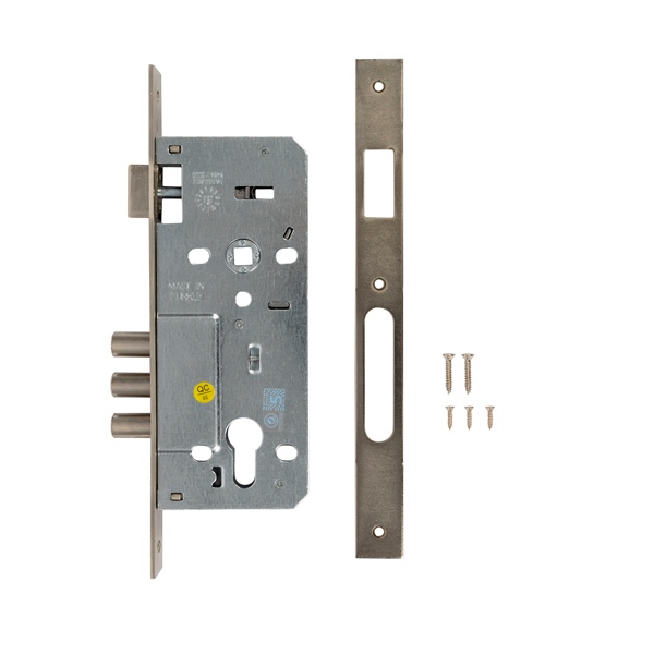 В конструкции имеются стальные ригели диаметром 12 мм. Их полный выход составляет 20 мм. Механизм управляется ручками и сердцевиной стандарта EURO DIN. Она в комплект не входит и докупается отдельно в зависимости от Ваших потребностей. Благодаря реверсивному цинковому язычку механизм подходит как для лево-, так и правосторонних дверей. Замок имеет отверстия для крепления протектора на сердцевину и стяжных винтов ручек на розетте.