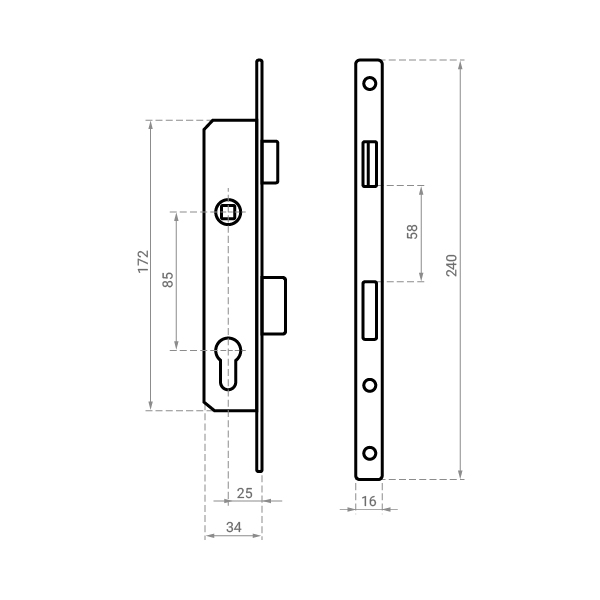 Главной особенностью данной модели является то, что он имеет узкую торцевую планку 16 мм. Как правило, такие замки устанавливаются исключительно на металлопластиковые двери. Его торцевая планка и корпус изготовлены из стали и оцинкованы. Это обеспечивает дополнительную защиту от коррозии. Благодаря реверсивному цинковому язычку замок подходит как для лево-, так и для правосторонних дверей. В конструкции имеется цинковый прямоугольный ригель. Его полный выход составляет 15 мм.