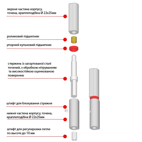 ALDEGHI LUIGI 1250 – это приварная петля для бронированных дверей и металлических рам. Является универсальной, поэтому подходит для полотен правого и левого открывания. Конструктивно состоит из 2-х секций – верхней и нижней размером Ø22x25 мм, шарикоподшипника и упорного подшипника, штифта и высокопрочных оцинкованных деталей.