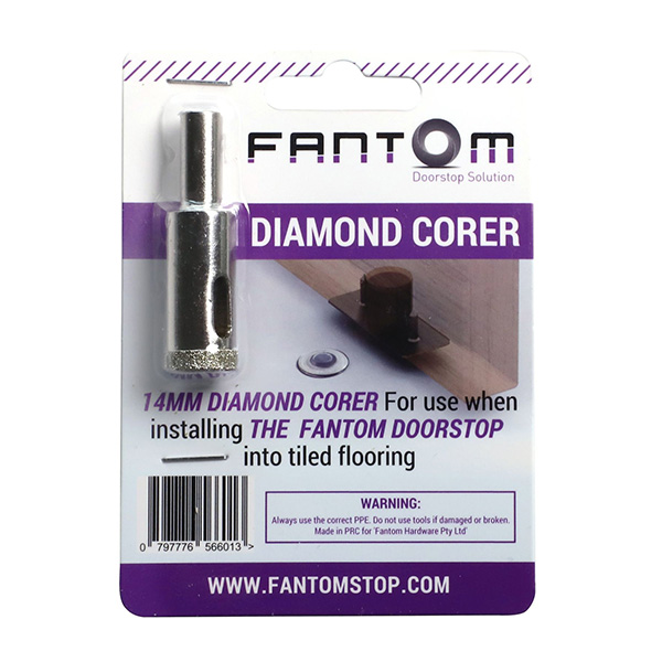 Алмазна фреза FANTOM - це допоміжний інструмент, який служить для установки стопорів FANTOM PREMIUM та потрібен для того, щоб просвердлити рівний круглий отвір діаметром 14 мм в будь-якій поверхні - будь то керамограніт або плитка з білої глини. Важливо пам’ятати, що свердлити потрібно повільно, починаючи під кутом 45°, і завжди використовувати воду.