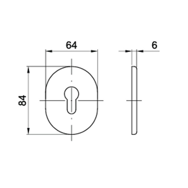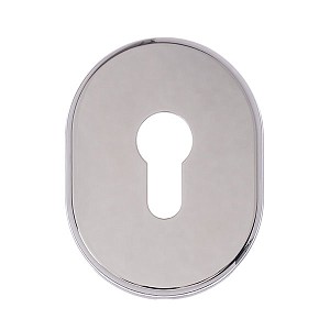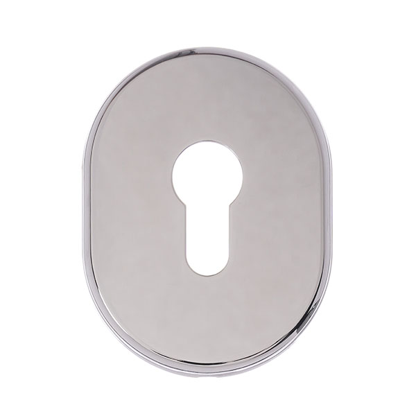 Накладка дає можливість приховати монтажні отвори, подряпини та інші пошкодження, які можуть з’явитись при установці замка і серцевини. Виготовлена із латуні, має овальну форму розміром 84х64 мм. В кольорі “хром полірований” найкраще буде доповнювати відповідного кольору протектор та двері сірих відтінків. Монтаж відбувається доволі просто з допомогою стяжних гвинтів.