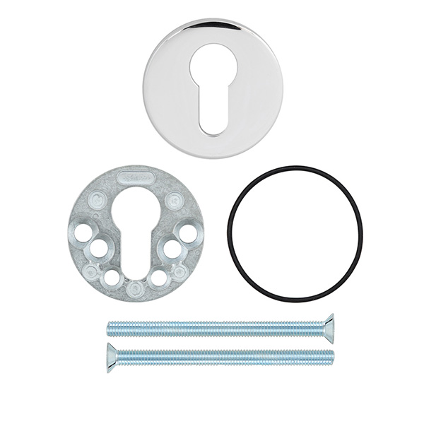 Декоративна накладка DISEC KT038 - це декоративний елемент, що призначений для надання дверним полотнам більш охайного вигляду. Використовується в парі із врізними броненакладками із замками і серцевинами стандарту EURO DIN. Кріпиться з внутрішньої сторони дверей за допомогою захисної шайби та гвинтів М6х40. Накладка дає можливість приховати монтажні отвори, подряпини та інші пошкодження, які можуть з’явитись при установці замка і серцевини. Виготовлена із латуні, має круглу форму діаметром 52 мм. В кольорі “хром полірований” найкраще буде доповнювати відповідного кольору протектор та двері світлих відтінків - від тепло-сірих до бежевих. Монтаж відбувається доволі просто.