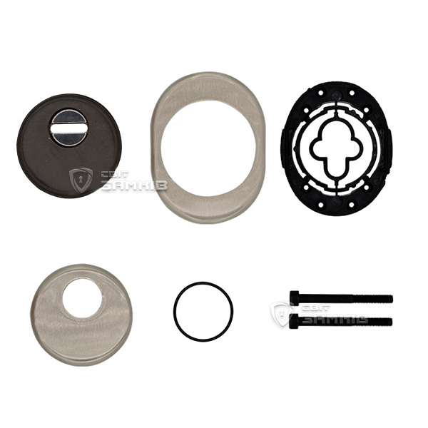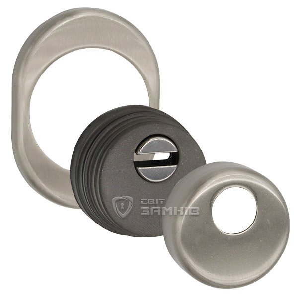 Для монтажу по діаметру протектора робиться отвір в дверному полотні. Кріпиться довкола серцевини стяжними гвинтами, створюючи монолітну конструкцію з нею. Таким чином, протектор захищає її разом із точкою кріплення в дверях від фізичних та силових методів злому — свердління, виламування та вибивання. Доступу до гвинтів кріплення немає і зірвати саму броненакладку надзвичайно складно. Висота (або товщина) її складає 25/33 мм, діаметр - 50 мм. В кольорі “нікель сатин” найкраще буде доповнювати двері світлих відтінків - від тепло-сірих до бежевих.
