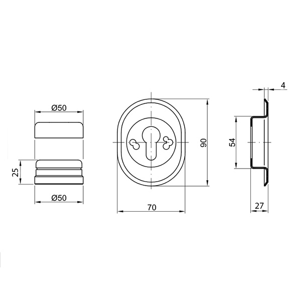 Висота (або товщина) протектора складає 25 мм, діаметр – 50 мм. Комплектується зовнішньою декоративною накладкою овальної форми для надання дверному полотну більш охайного вигляду. В кольорі “хром полірований” найкраще буде доповнювати двері відповідних сірих відтінків.