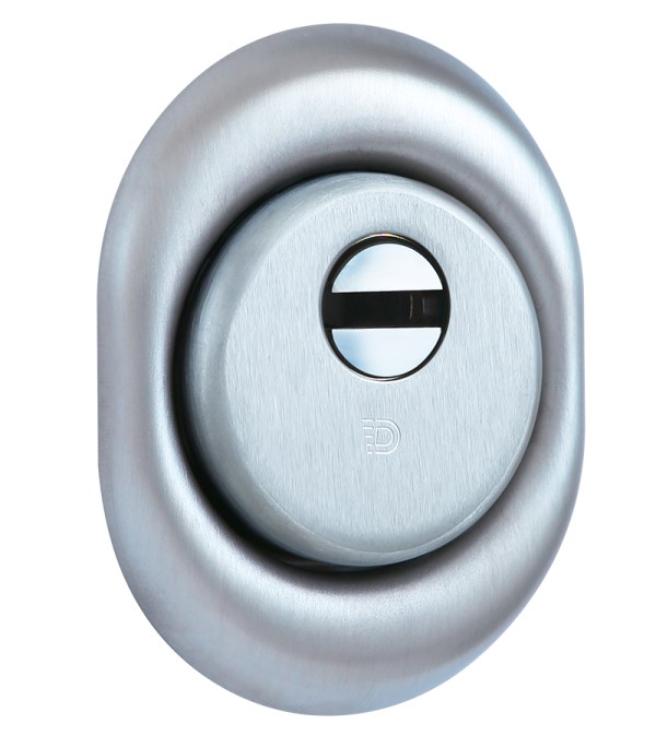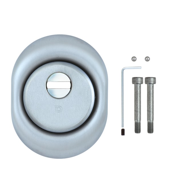 Монтується врізним методом: по його діаметру робиться отвір в дверному полотні. Кріпиться наскрізно довкола серцевини стяжними гвинтами М6 з технологією Flex. Її суть заключається в дрібнішій різьбі та спеціальній насічці. Завдяки цьому та спеціальному виду твердої сталі гвинти витримують навантаження в 5 раз більше, ніж звичайні. Так вони створюють монолітну конструкцію із серцевиною. Таким чином, протектор захищає її разом із точкою кріплення в дверях від фізичних та силових методів злому — свердління, виламування та вибивання. Доступу до гвинтів кріплення немає і зірвати саму броненакладку надзвичайно складно. Також вкручується в посилену зовнішню “юбку”. Висота (або товщина) протектора складає 25 мм, діаметр - 50 мм. Виготовлений із латуні. Монтується на двері за допомогою пластика та саморізів. В кольорі “хром матовий” найкраще буде доповнювати двері світлих відтінків - від тепло-сірих до бежевих.