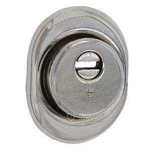 Монтується врізним методом: по його діаметру робиться отвір в дверному полотні. Кріпиться наскрізно довкола серцевини стяжними гвинтами М6 з технологією Flex. Її суть заключається в дрібнішій різьбі та спеціальній насічці. Завдяки цьому та спеціальному виду твердої сталі гвинти витримують навантаження в 5 раз більше, ніж звичайні. Так вони створюють монолітну конструкцію із серцевиною. Таким чином, протектор захищає її разом із точкою кріплення в дверях від фізичних та силових методів злому — свердління, виламування та вибивання. Доступу до гвинтів кріплення немає і зірвати саму броненакладку надзвичайно складно. Також вкручується в посилену зовнішню “юбку”. Висота (або товщина) протектора складає 25 мм, діаметр - 50 мм. Виготовлений із латуні. Монтується на двері за допомогою пластика та саморізів. В кольорі “хром полірований” найкраще буде доповнювати двері світлих відтінків - від тепло-сірих до бежевих.