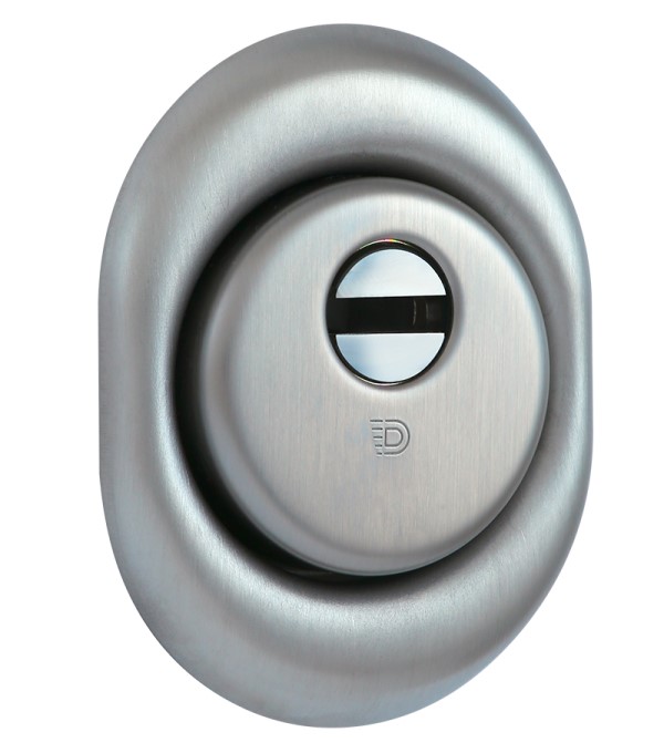 Монтується врізним методом: по його діаметру робиться отвір в дверному полотні. Кріпиться наскрізно довкола серцевини стяжними гвинтами М6 з технологією Flex. Її суть заключається в дрібнішій різьбі та спеціальній насічці. Завдяки цьому та спеціальному виду твердої сталі гвинти витримують навантаження в 5 раз більше, ніж звичайні. Так вони створюють монолітну конструкцію із серцевиною. Таким чином, протектор захищає її разом із точкою кріплення в дверях від фізичних та силових методів злому — свердління, виламування та вибивання. Доступу до гвинтів кріплення немає і зірвати саму броненакладку надзвичайно складно. Також вкручується в посилену зовнішню “юбку”. Висота (або товщина) протектора складає 25 мм, діаметр - 50 мм. Виготовлений із латуні. Монтується на двері за допомогою пластика та саморізів. В кольорі матової нержавіючої сталі найкраще буде доповнювати двері світлих відтінків - від тепло-сірих до бежевих.