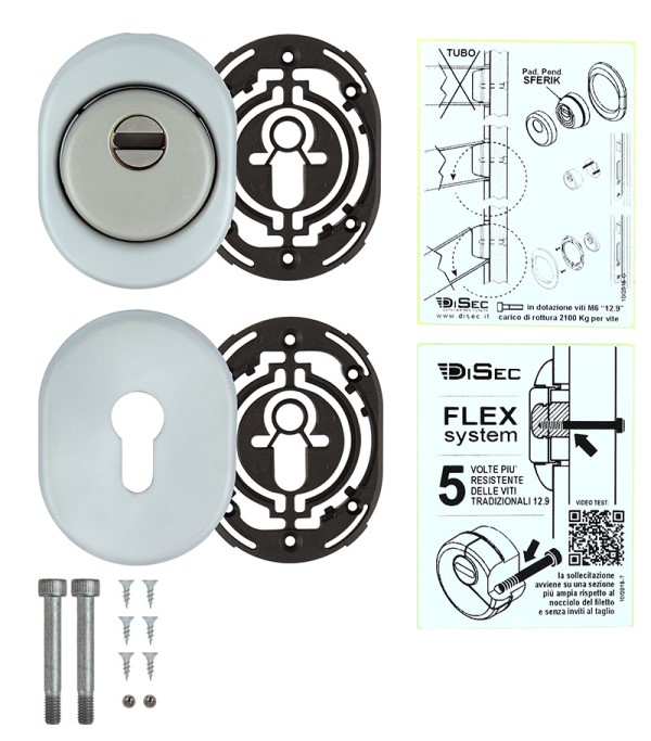 Монтується врізним методом: по його діаметру робиться отвір в дверному полотні. Кріпиться наскрізно довкола серцевини стяжними гвинтами М6 з технологією Flex. Її суть заключається в дрібнішій різьбі та спеціальній насічці. Завдяки цьому та спеціальному виду твердої сталі гвинти витримують навантаження в 5 раз більше, ніж звичайні. Так вони створюють монолітну конструкцію із серцевиною. Таким чином, протектор захищає її разом із точкою кріплення в дверях від фізичних та силових методів злому — свердління, виламування та вибивання. Для додаткового захисту від свердління в отвори кріплення встановлюються загартовані кульки (входять до стандартного комплекту). Доступу до гвинтів кріплення немає і зірвати саму броненакладку надзвичайно складно. Висота (або товщина) протектора складає 25 мм, діаметр - 50 мм. В кольорі “нікель сатин” найкраще буде доповнювати двері світлих відтінків - від тепло-сірих до бежевих.