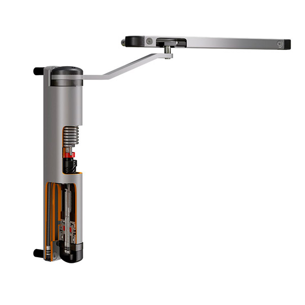 Швидкість закривання можна налаштовувати індивідуально шестигранним ключем. Є можливість активації фінального дотягування. Довготривалу роботу механізму гарантує обертове ущільнення. Сила закривання рівномірна на всі максимальні 180°. Не потребує використання стопора для обмеження кута відкривання.