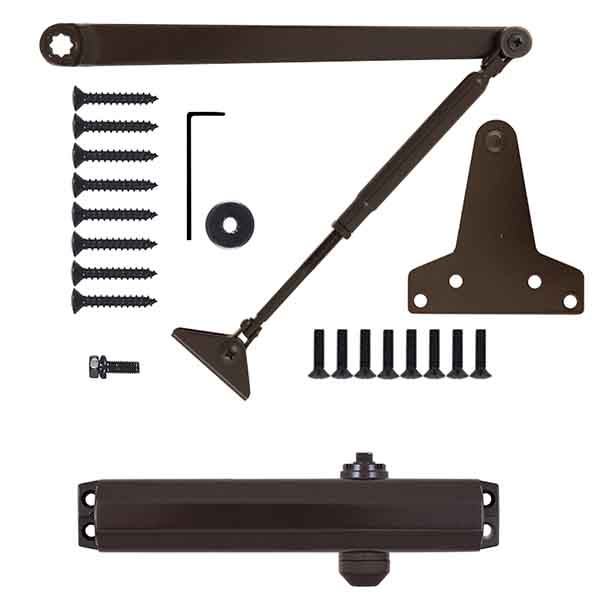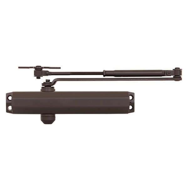 Продукція японського виробника RYOBI по праву визнана в усьому світі завдяки своїй відмінній якості. Дана модель RYOBI D-2005V BC UNIV встановлюється накладним монтажем на дверні полотна масою до 100 кг та шириною до 1250 мм. Є можливість встановлення за допомогою кронштейна паралельного положення тяги відносно дверей задля збереження дизайну приміщення чи використання дотягувача в умовах обмеженого простору. Тоді максимальна вага і ширина полотна повинні бути меншими. Гідравлічний привід забезпечує чітку роботу дотягувача з кутом відкривання до 180°. Безпосередньо на корпусі є можливість регулювати основну швидкість в межах 180°-10°, швидкість захлопування - 10°-0° та гальмо відчинення - 75°-180°. Дана функція захищає дверне полотно від удару об стіну та виривання тяги дотягувача. Завдяки цьому можна досягнути індивідуального налаштування зачинення дверей так як Вам потрібно. Особливістю дотягувачів RYOBI є спеціальне термоконстантне масло. Воно забезпечує стабільну роботу навіть при великому перепаді температур. Взагалі робоча температура варіюється в діапазоні від -20 до +45°С. RYOBI D-2005V BC UNIV може бути встановлений на ліво і правосторонні двері з можливістю відкривання як всередину так і назовні. В даній комплектації присутня стандартна тяга без фіксації дверного полотна у відкритому положенні. Проте даний дотягувач сертифікований для використання з протипожежними дверима. В коричневому кольорі найкраще буде доповнювати двері подібних темних відтінків для того, щоб максимально уникнути контрастів та не привертати зайвої уваги.