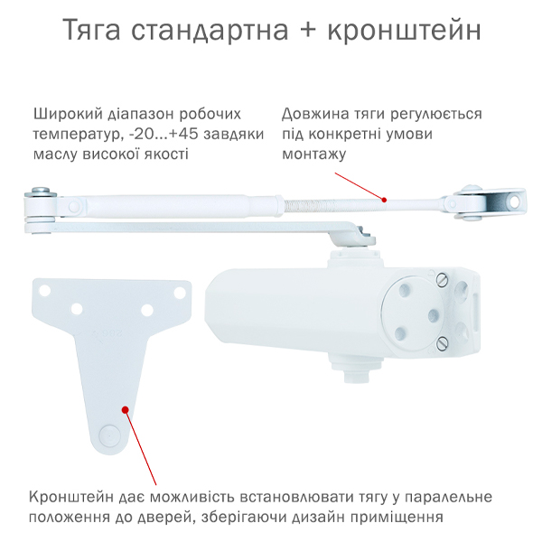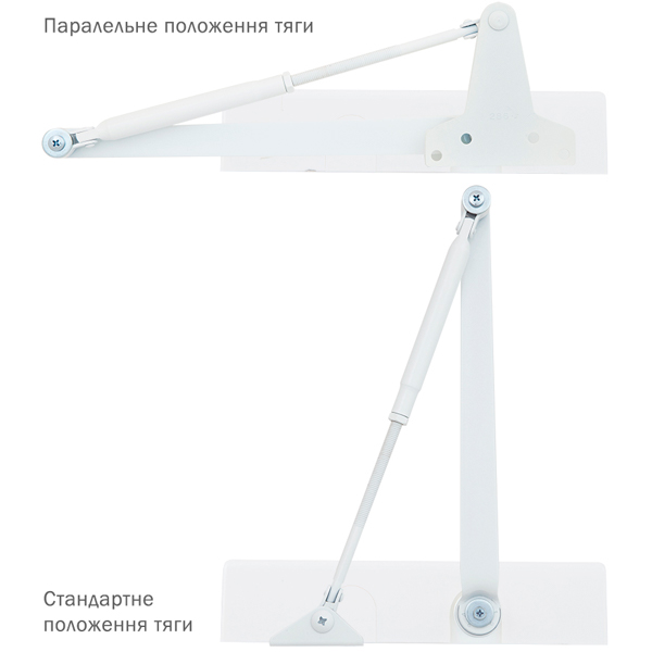 Є можливість встановлення за допомогою кронштейна паралельного положення тяги відносно дверей задля збереження дизайну приміщення чи використання дотягувача в умовах обмеженого простору. Тоді максимальна вага і ширина полотна повинні бути меншими.