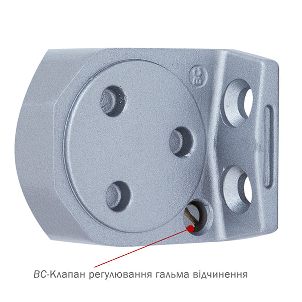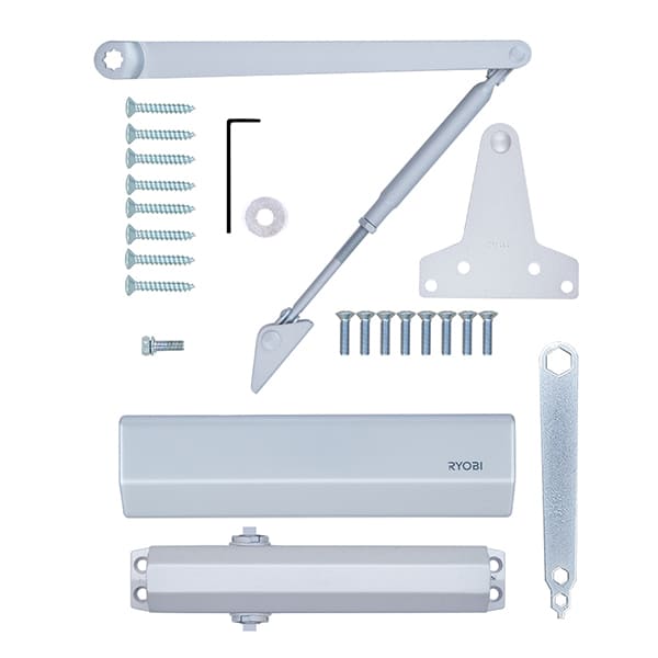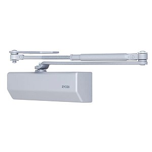 Продукція японського виробника RYOBI по праву визнана в усьому світі завдяки своїй відмінній якості. Дана модель RYOBI D-2055V BC UNIV встановлюється накладним монтажем на дверні полотна масою до 100 кг та шириною до 1250 мм. Є можливість встановлення за допомогою кронштейна паралельного положення тяги відносно дверей задля збереження дизайну приміщення чи використання дотягувача в умовах обмеженого простору. Тоді максимальна вага і ширина полотна повинні бути меншими. Гідравлічний привід забезпечує чітку роботу дотягувача з кутом відкривання до 180°. Безпосередньо на корпусі є можливість регулювати основну швидкість в межах 180°-10°, швидкість захлопування - 10°-0° та гальмо відчинення - 75°-180°. Дана функція захищає дверне полотно від удару об стіну та виривання тяги дотягувача. Завдяки цьому можна досягнути індивідуального налаштування зачинення дверей так як Вам потрібно. Особливістю дотягувачів RYOBI є спеціальне термоконстантне масло. Воно забезпечує стабільну роботу навіть при великому перепаді температур. Взагалі робоча температура варіюється в діапазоні від -20 до +45°С. RYOBI D-2055V BC UNIV може бути встановлений на ліво і правосторонні двері з можливістю відкривання як всередину так і назовні. В даній комплектації присутня стандартна тяга без фіксації дверного полотна у відкритому положенні. Проте даний дотягувач сертифікований для використання з протипожежними дверима. В сірому кольорі найкраще буде доповнювати двері подібних відтінків для того, щоб максимально уникнути контрастів та не привертати зайвої уваги.