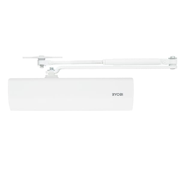 Продукція японського виробника RYOBI по праву визнана в усьому світі завдяки своїй відмінній якості. Дана модель RYOBI D-2550 BC UNIV встановлюється накладним монтажем на дверні полотна масою до 80 кг та шириною до 1100 мм. Є можливість встановлення за допомогою кронштейна паралельного положення тяги відносно дверей задля збереження дизайну приміщення чи використання дотягувача в умовах обмеженого простору. Тоді максимальна вага і ширина полотна повинні бути меншими. Гідравлічний привід забезпечує чітку роботу дотягувача з кутом відкривання до 180°. Безпосередньо на корпусі є можливість регулювати основну швидкість в межах 180°-10°, швидкість захлопування - 10°-0° та гальмо відчинення - 75°-180°. Дана функція захищає дверне полотно від удару об стіну та виривання тяги дотягувача. Завдяки цьому можна досягнути індивідуального налаштування зачинення дверей так як Вам потрібно. Особливістю дотягувачів RYOBI є спеціальне термоконстантне масло. Воно забезпечує стабільну роботу навіть при великому перепаді температур. Взагалі робоча температура варіюється в діапазоні від -20 до +45°С. RYOBI D-2550 BC UNIV може бути встановлений на ліво і правосторонні двері з можливістю відкривання як всередину так і назовні. В даній комплектації присутня стандартна тяга без фіксації дверного полотна у відкритому положенні. Проте даний дотягувач сертифікований для використання з протипожежними дверима. В білому кольорі найкраще буде доповнювати двері подібних світлих відтінків для того, щоб максимально уникнути контрастів та не привертати зайвої уваги.
