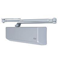 Продукція японського виробника RYOBI по праву визнана в усьому світі завдяки своїй відмінній якості. Дана модель RYOBI D-2550 BC UNIV встановлюється накладним монтажем на дверні полотна масою до 80 кг та шириною до 1100 мм. Є можливість встановлення за допомогою кронштейна паралельного положення тяги відносно дверей задля збереження дизайну приміщення чи використання дотягувача в умовах обмеженого простору. Тоді максимальна вага і ширина полотна повинні бути меншими. Гідравлічний привід забезпечує чітку роботу дотягувача з кутом відкривання до 180°. Безпосередньо на корпусі є можливість регулювати основну швидкість в межах 180°-10°, швидкість захлопування - 10°-0° та гальмо відчинення - 75°-180°. Дана функція захищає дверне полотно від удару об стіну та виривання тяги дотягувача. Завдяки цьому можна досягнути індивідуального налаштування зачинення дверей так як Вам потрібно. Особливістю дотягувачів RYOBI є спеціальне термоконстантне масло. Воно забезпечує стабільну роботу навіть при великому перепаді температур. Взагалі робоча температура варіюється в діапазоні від -20 до +45°С. RYOBI D-2550 BC UNIV може бути встановлений на ліво і правосторонні двері з можливістю відкривання як всередину так і назовні. В даній комплектації присутня стандартна тяга без фіксації дверного полотна у відкритому положенні. Проте даний дотягувач сертифікований для використання з протипожежними дверима. В сірому кольорі найкраще буде доповнювати двері подібних відтінків для того, щоб максимально уникнути контрастів та не привертати зайвої уваги.