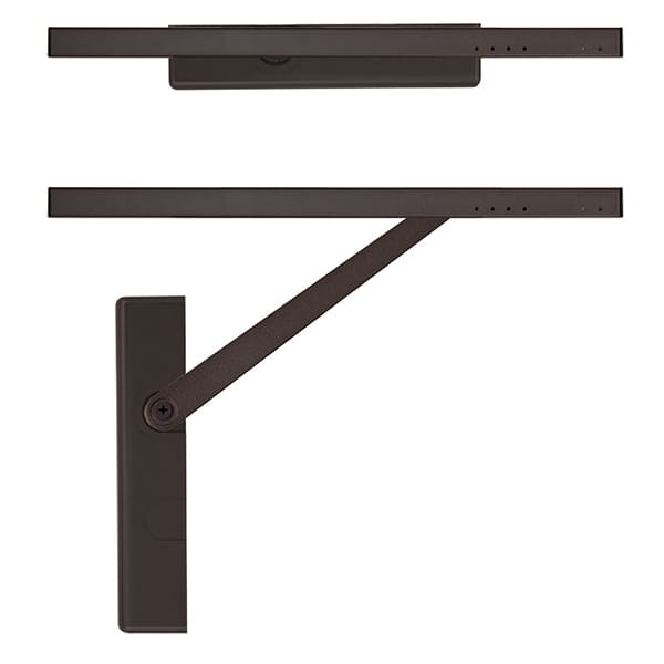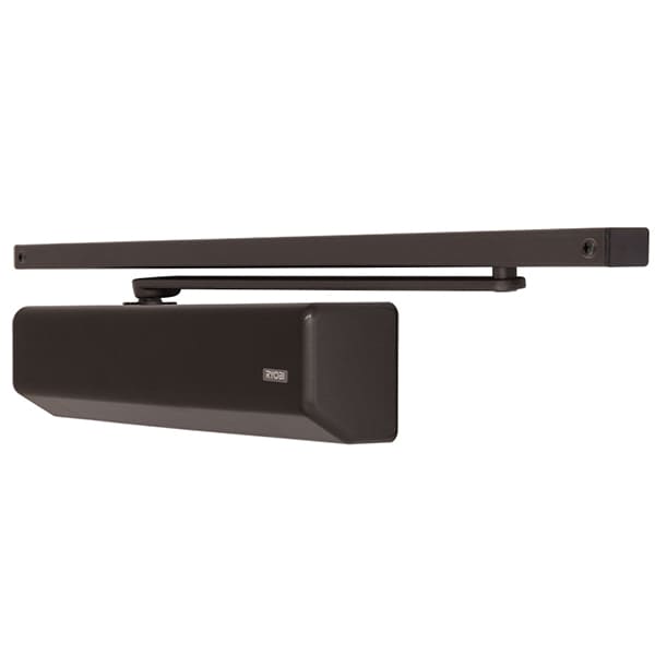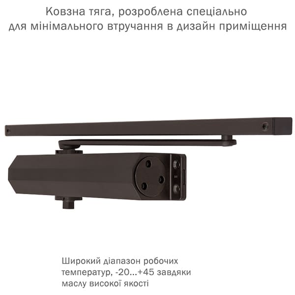 Продукція японського виробника RYOBI по праву визнана в усьому світі завдяки своїй відмінній якості. Дана модель RYOBI D-3554T BC/DA SLD встановлюється накладним монтажем на промислові дверні полотна масою до 80 кг та шириною до 1100 мм. Гідравлічний привід забезпечує чітку роботу дотягувача з кутом відкривання до 180°. Безпосередньо на корпусі є можливість регулювати основну швидкість в межах 180°-10°, швидкість захлопування - 10°-0° та гальмо відчинення - 75°-180°. Дана функція захищає дверне полотно від удару об стіну та виривання тяги дотягувача. Також фішкою цієї моделі є функція уповільнення зачинення. Це зручно, коли проходять багато людей чи потрібно занести вантаж. Загалом завдяки таким можливостям регулювання можна добитись максимально індивідуального налаштування зачинення дверей. Особливістю дотягувачів RYOBI є спеціальне термоконстантне масло. Воно забезпечує стабільну роботу навіть при великому перепаді температур. Взагалі робоча температура варіюється в діапазоні від -20 до +45°С. RYOBI D-3554T BC/DA SLD може бути встановлений на ліво і правосторонні двері з можливістю відкривання як всередину так і назовні. В даній комплектації присутня ковзна тяга без фіксації дверного полотна у відкритому положенні. Проте даний дотягувач сертифікований для використання з протипожежними дверима. В коричневому кольорі найкраще буде доповнювати двері подібних темних відтінків для того, щоб максимально уникнути контрастів та не привертати зайвої уваги.