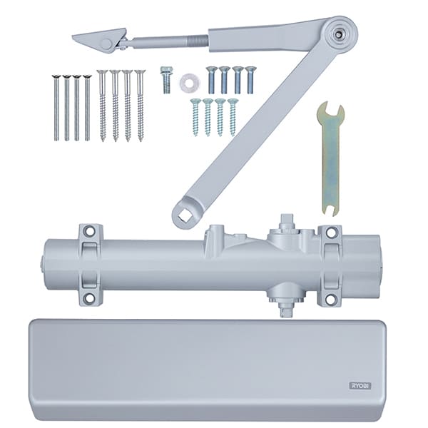 Продукція японського виробника RYOBI по праву визнана в усьому світі завдяки своїй відмінній якості. Дана модель RYOBI DS-4550 BC/DA STD HO встановлюється накладним монтажем на великогабаритні дверні полотна масою до 200 кг та шириною до 1600 мм. Гідравлічний привід забезпечує чітку роботу дотягувача з кутом відкривання до 180°. Безпосередньо на корпусі є можливість регулювати основну швидкість в межах 180°-10°, швидкість захлопування - 10°-0° та гальмо відчинення - 75°-180°. Дана функція захищає дверне полотно від удару об стіну та виривання тяги дотягувача. Також фішкою цієї моделі є функція уповільнення зачинення. Це зручно, коли проходять багато людей чи потрібно занести вантаж. Загалом завдяки таким можливостям регулювання можна добитись максимально індивідуального налаштування зачинення дверей. Особливістю дотягувачів RYOBI є спеціальне термоконстантне масло. Воно забезпечує стабільну роботу навіть при великому перепаді температур. Взагалі робоча температура варіюється в діапазоні від -20 до +45°С. RYOBI DS-4550 BC/DA STD HO може бути встановлений на ліво і правосторонні двері з можливістю відкривання як всередину так і назовні. В даній комплектації присутня стандартна тяга тяга з фіксацією дверного полотна у відкритому положенні. Це дає можливість залишити двері відчиненими для провітрювання чи для зручності користування у комерційних приміщеннях. В сірому кольорі найкраще буде доповнювати двері подібних відтінків для того, щоб максимально уникнути контрастів та не привертати зайвої уваги.