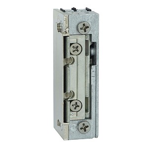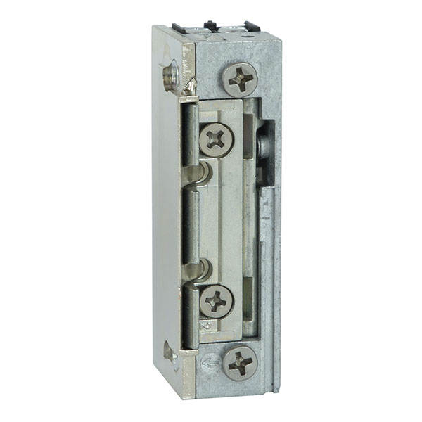 Електрозащіпка працює в нормально відімкненому стані. Це означає, що вона замкнена при подачі живлення, а відмикання відбувається зняттям напруги. Стане особливо актуальним для випадків, коли існує необхідність забезпечити гарантоване розблокування відчинених дверей при зникненні напруги живлення. Наприклад, для безперешкодної швидкої евакуації людей без використання ключів. Напруга складає 12В постійного струму. Має язичок спеціальної радіальної форми, яка при відкриванні зміщується в глибину защіпки. За рахунок цього виріз в рамі під нього потрібен буде мінімальний. Язичок регулюється відносно корпусу з діапазоном 3 мм.