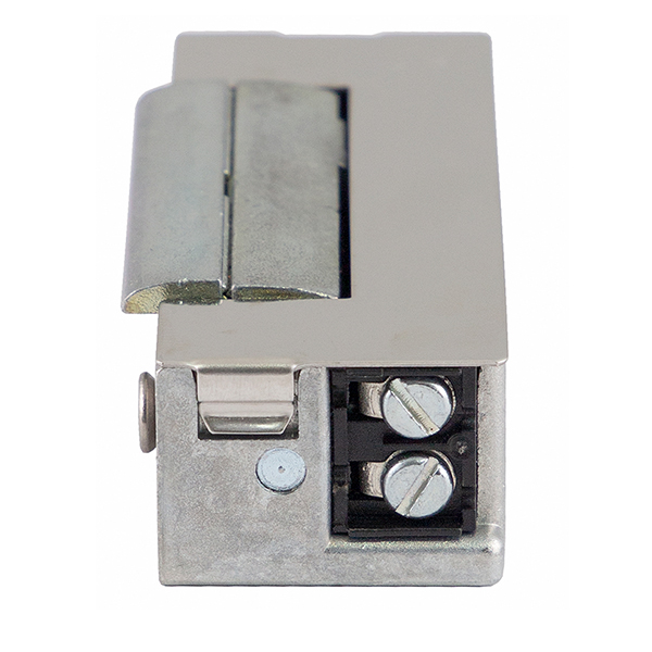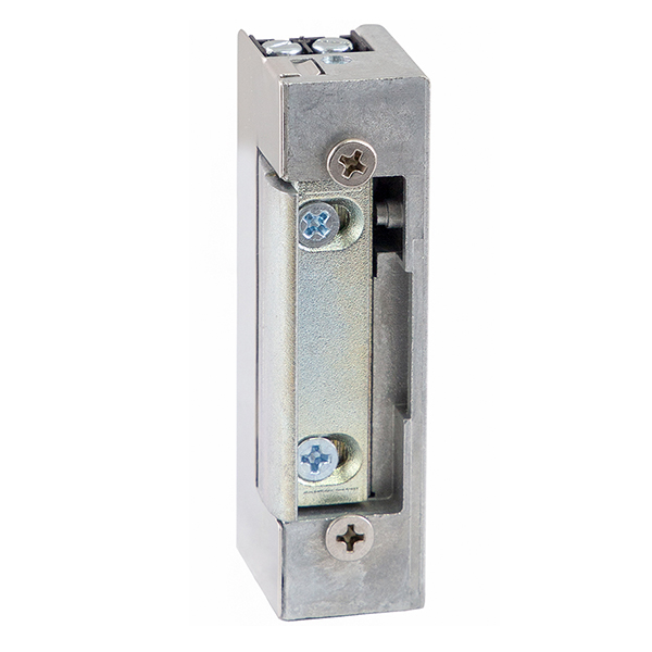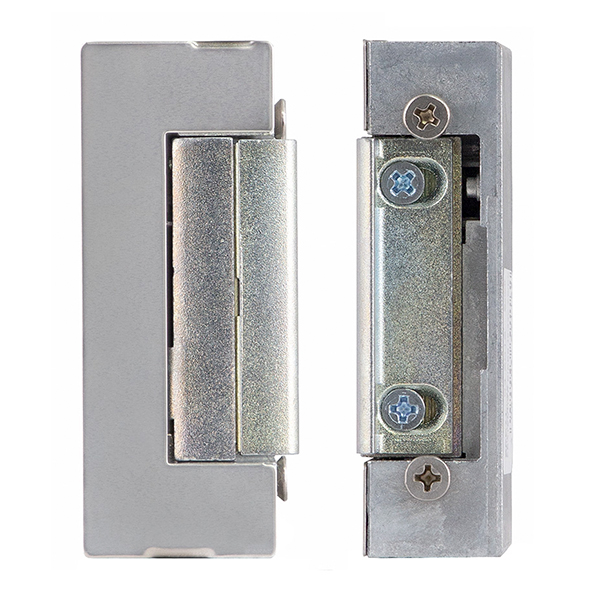 Електрозащіпка працює в нормально замкненому стані. Це означає, що вона замкнена без живлення, а відмикання відбувається поданням напруги. Напруга складає 10-24 В постійного або змінного струму. Має язичок спеціальної радіальної форми, яка при відкриванні зміщується в глибину защіпки. За рахунок цього виріз в рамі під нього потрібен буде мінімальний. Язичок регулюється відносно корпусу з діапазоном 3 мм.