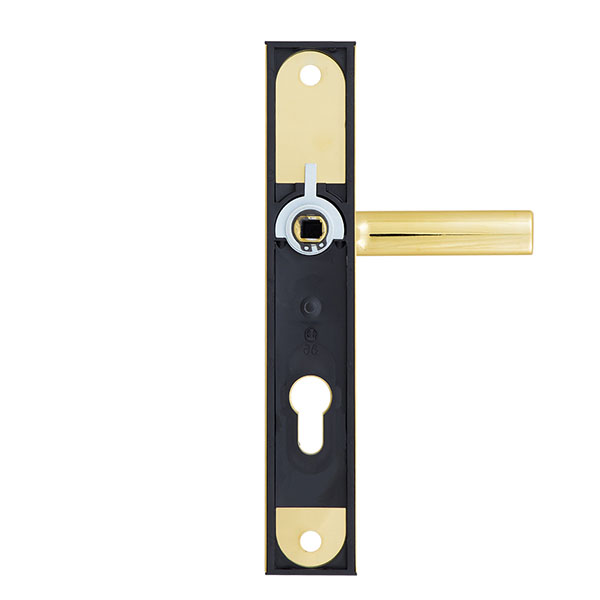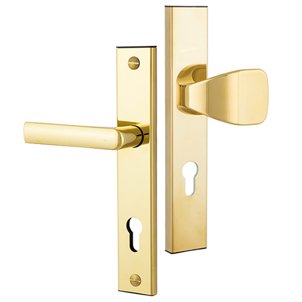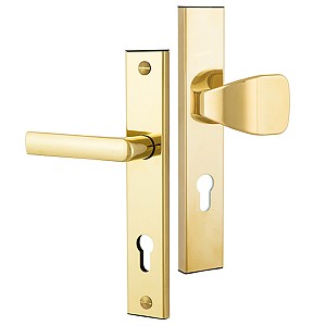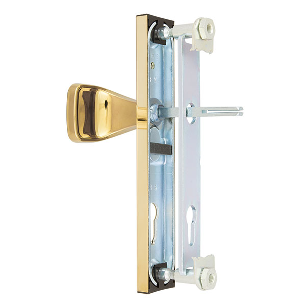 Захисні ручки на планці чеського виробництва ROSTEX. Це дверна фурнітура високої якості розроблена для приміщень з великим трафіком людей. Ручки та планки виготовляються із нержавіючої сталі, а декоративна плата, яка накладається на планку, виготовляється із цинкового сплаву. Монтується ця модель на два стяжні гвинти М8, завдяки чому ручки міцно закріплюються на планці і мають захист від вандального зламу. Все це робить дану фурнітуру стійкою до виламування та інших силових методів. Ще однією особливістю є різний тип ручок. З одного боку це звичайна нажимна ручка, а з іншого фіксована. Такі ручки забезпечать швидке та зручне користування проміжною кімнатою в офісі тощо. Сучасний мінімалістичний дизайн гармонійно доповнить дверне полотно з прямими лініями або скляними вставками. Яскравий колір – титан PVD – добре поєднується з інтер’єром в світло-золотих відтінках. Покриття методом гальваніки гарантує надійний захист кольорового відтінку від стирання до 120 місяців. При виборі зверніть увагу, що такі ручки підходять лише для механізму замка з міжосьовою відстанню 72 мм.   За необхідності монтажу фурнітури на товстіші двері рекомендуємо придбати відповідний подовжуючий набір.